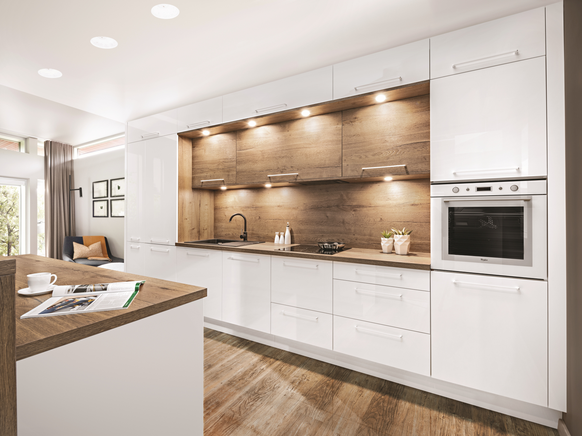 Jeżeli zależy nam na wyeksponowaniu uchwytów i podkreśleniu ich dekoracyjnej roli, wybierzmy modny i gustowny kolor, jak eleganckie i stylowe złoto lub nowoczesną i wyrazistą, matową czerń. Efektownie będzie wyglądała w postaci uchwytów krawędziowych zintegrowanych z obrzeżem okalającym front w kontrastowym dekorze. To nowa koncepcja frontu, dostępna w ofercie firmy KAM, w której zrównoważono aspekty użytkowe z atrakcyjnym wzornictwem.